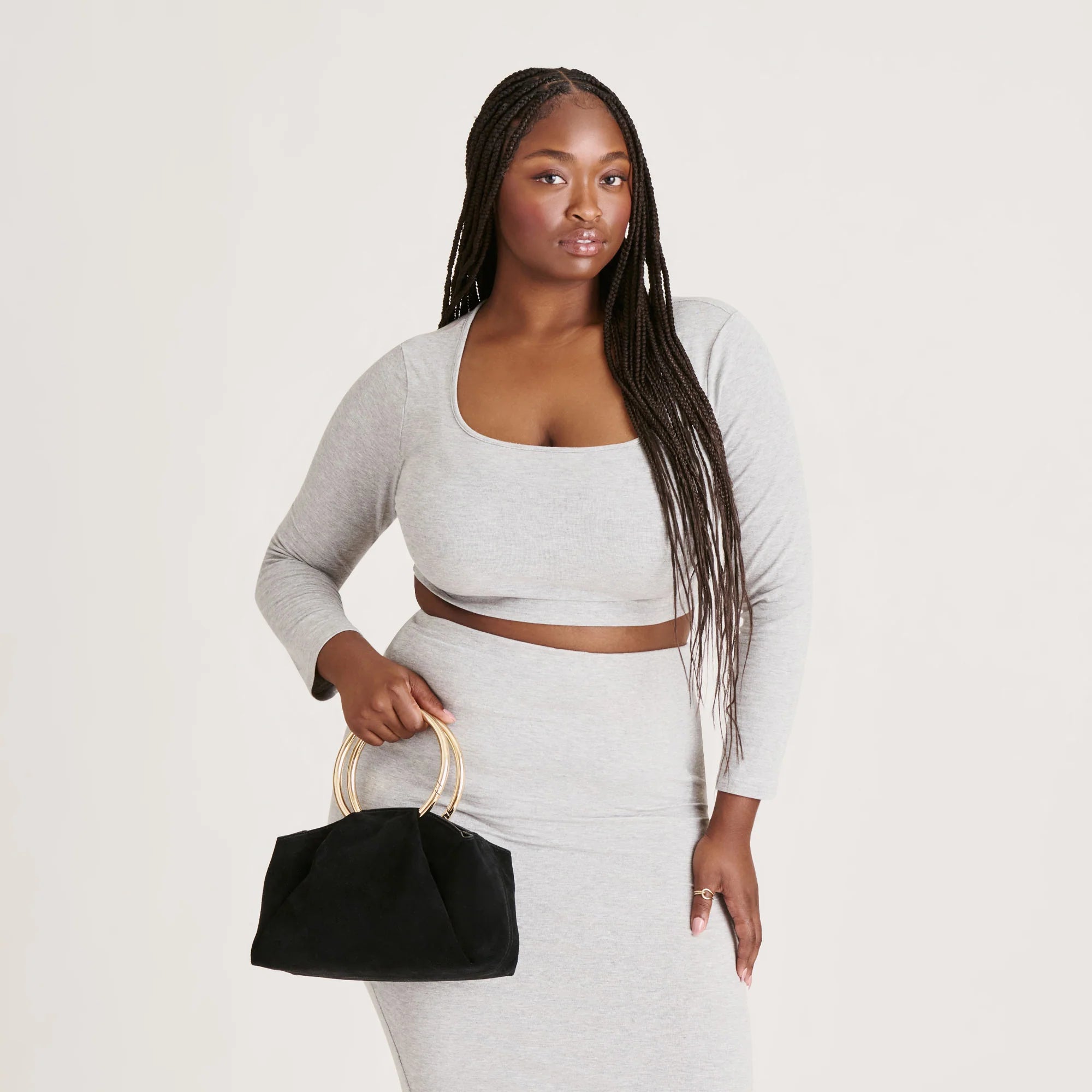 CHANNING is the perfect understated bag to dress up with. Her simple suede silhouette and gold o-shaped ring scream quiet luxury. Carry rich espresso or classic black with sweater dresses and date night looks.